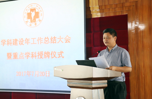 张志平院长总结回顾了2016年该院在学科建设方面所做的工作,学科建设、科研成果取得了全方面突破性的进展,对被授牌科室表示了祝贺,并勉励大家在今后的工作中再接再厉。张院长说到,学科建设是医院发展与改革的“永恒”主题,是医院建设竞争力的关键所在,是医院发挥医疗、教学、科研三大功能的基本平台。他提出了几点要求,一是更加重视学科建设,院领导、科室负责人要有高度责任感、使命感、紧迫感。二是要扎实推进学科建设,领导带头搞、要有硬指标、更要勤指导。加大高层次人才引进力度;加强员工进修和培训;鼓励新技术、新项目开展;GCP一期建设;积极申报科研课题、文章,成果申报、成果转换等。三是要力争取得更大突破。要全院上下,齐心协力,稳步推进学科建设工作再上一层楼,使学科建设实力与三级甲等综合型教学医院的地位相匹配,推动附院进入快速健康发展的快车道!