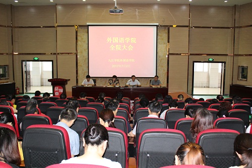 7月2日上午,外国语学院在香远楼三楼学术报告厅召开全院大会,院领导韩琨、杨杰、柴克清、彭晓及全院教职工参加。会议由党委书记杨杰主持。